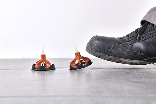 Les bases SOS s'insèrent dans le joint (minimum 1,5mm) tournent de 90° et se tendent en vissant l'écrou, obtenant ainsi le nivellement du carreau.